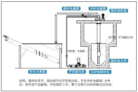 由于叶轮叶浆向上倾斜,旋转时将使池中的污水呈螺旋状加速,形成涡流态,产生留心力。同时池内污水流在叶轮叶片搅拌剪切力的作用下,互相剥离,依靠砂的自身重力和旋流的离心力,使砂粒沿池壁呈螺旋线加速沉降,向中心砂斗积聚,经气提或泵提升后排出池外作进一步的处理。在此过程中,适当的桨叶角度和线速度条件,使污水中的砂粒受到冲刷,并保持好的沉降效果,而原来粘附在砂粒上的有机物,以及重量小的物质,随污水一同流出旋流沉砂池,进入后续工序继续处理,砂与少量污水进入池外砂水分离器内,砂经分离后外排,污水回流至格栅井。