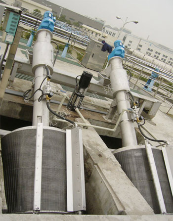旋转清污网筒在水中以35°倾角做每分钟5~8r/min的圆周运动,网筒的1/3浸没在水中。污水及漂浮物从网筒下口进入网筒内部,漂浮物附着于网筒内壁从水中带出,当网筒转到高点,杂质由于重力作用掉入垃圾输送系统,经输送压榨至出料口。被过滤的污水经过网筒间隙流走。