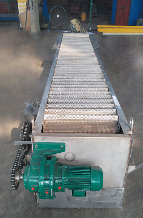 网板式阶梯格栅机能清除漂浮物、纤维物质,运行时不堵塞雍水,能将栅渣清除干净。主要由驱动装置、机架、传动链轮、牵引链条、网板及电气控制柜等主要部件组成。工作时网板在二侧传动链条的带动下,自下而上将整个渠道宽度范围内的污物向上提取,抵达上部时,通过链轮的转向功能,自动完成卸污工作。